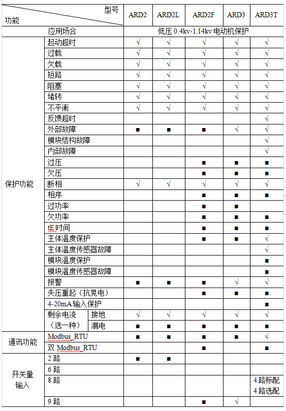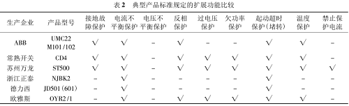 目前,企業生產的電動機保護器典型產品基本功能比較如表 1 所示。