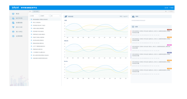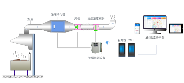 對油煙排污數據的監測,包括油煙排放濃度,顆粒物,NmHc等數值采集監測;同時對監控風機和凈化器的啟停狀態、運行數據進行監測。
