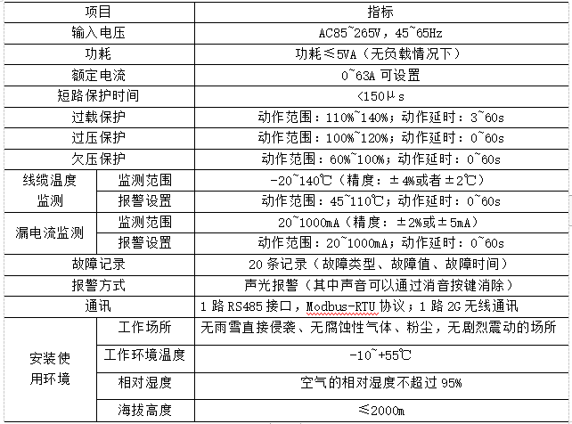 產品具有短路保護、過載保護、表內超溫保護、過欠壓保護、配電線纜溫度監測、漏電流監測功能、通訊等功能。