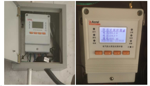 現場采用壁掛式的安裝方式,將保護器安裝在安裝箱中,然后通過安裝箱的開孔將保護器接入到配電線路中,然后從保護器中年將出線引出到末端回路,將與保護器配套的傳感器安裝在相應的位置,完成電氣防火限流式保護器的安裝,現場安裝圖片如下: