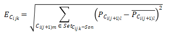 能耗指數(shù):能耗指數(shù)可以反應(yīng)出能耗網(wǎng)絡(luò)中一個節(jié)點的能耗量在該節(jié)點所在等級中所占的比例,若節(jié)點Cij+1l表示節(jié)點Cijk關(guān)系子集SetCijk-Son中的一個節(jié)點,則能耗指數(shù)P的計算式為: