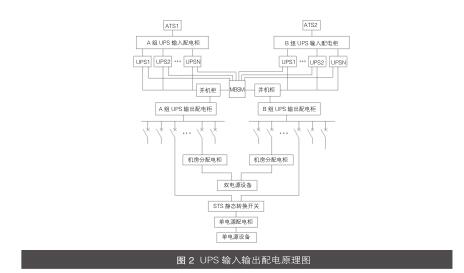 對于單電源設備來說,從兩套UPS冗余并機系統的輸出配電柜A和B分別送出兩路