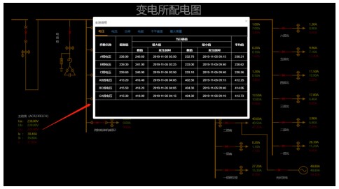 通過矢量配電圖監(jiān)測(cè)變電所用電情況,畫面響應(yīng)遙信變位、遙測(cè)越限報(bào)警,點(diǎn)擊某個(gè)配電回路后可以查詢?cè)撆潆娀芈返母黝愒敿?xì)用電參數(shù),包括實(shí)時(shí)值、平均值;
