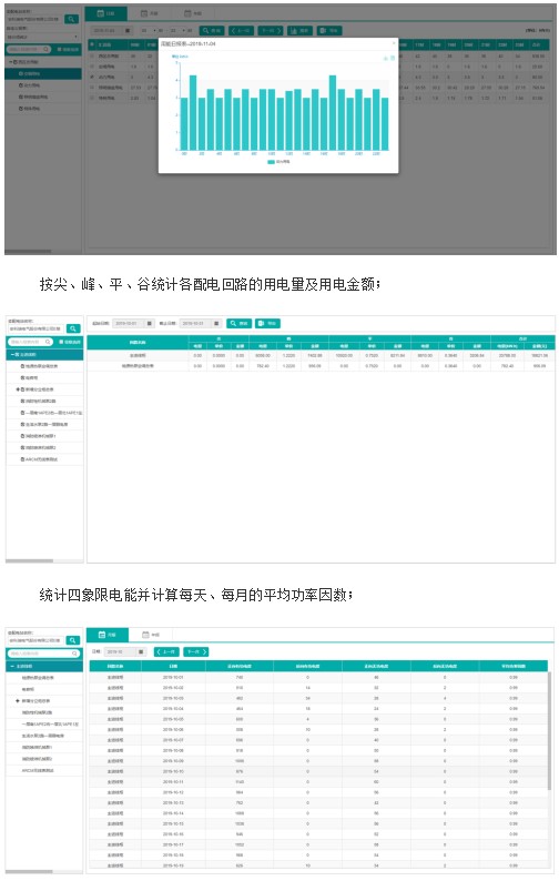 按照配電回路、區(qū)域、部門、分項(xiàng)(照明、空調(diào)、動(dòng)力等)統(tǒng)計(jì)每時(shí)、每天、每月、每年用電數(shù)據(jù),并進(jìn)行同環(huán)比分析;